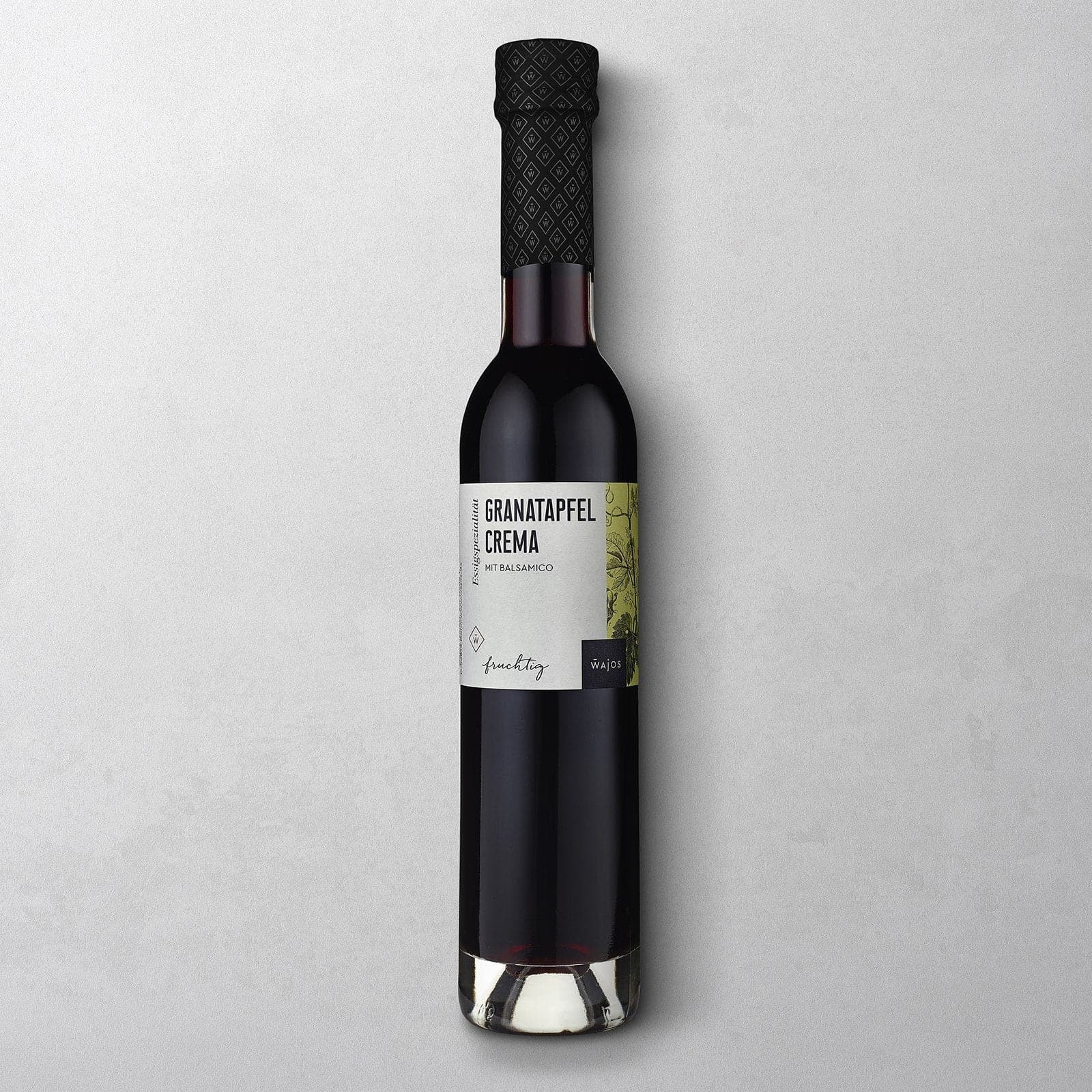 Ben je op zoek naar een fruitige granaatappel balsamico azijn? De Wajos granaatappel crema met zijn milde, licht zurige smaak en de fijnste balsamico azijn verfijnt niet alleen groene salades als fruitige granaatappeldressing met olijfolie, maar smaakt ook heerlijk bij fruit. De specialiteit granaatappelazijn is bijzonder lekker als fruitige toets in hartige gerechten. Als geschikte olie raden wij de Wajos Walnut Gourmetolie aan – een onverslaanbaar lekkere combinatie met granaatappelazijn in de dressing. Ontdek ook onze granaatappel balsamico azijn met 5% zuurgraad.